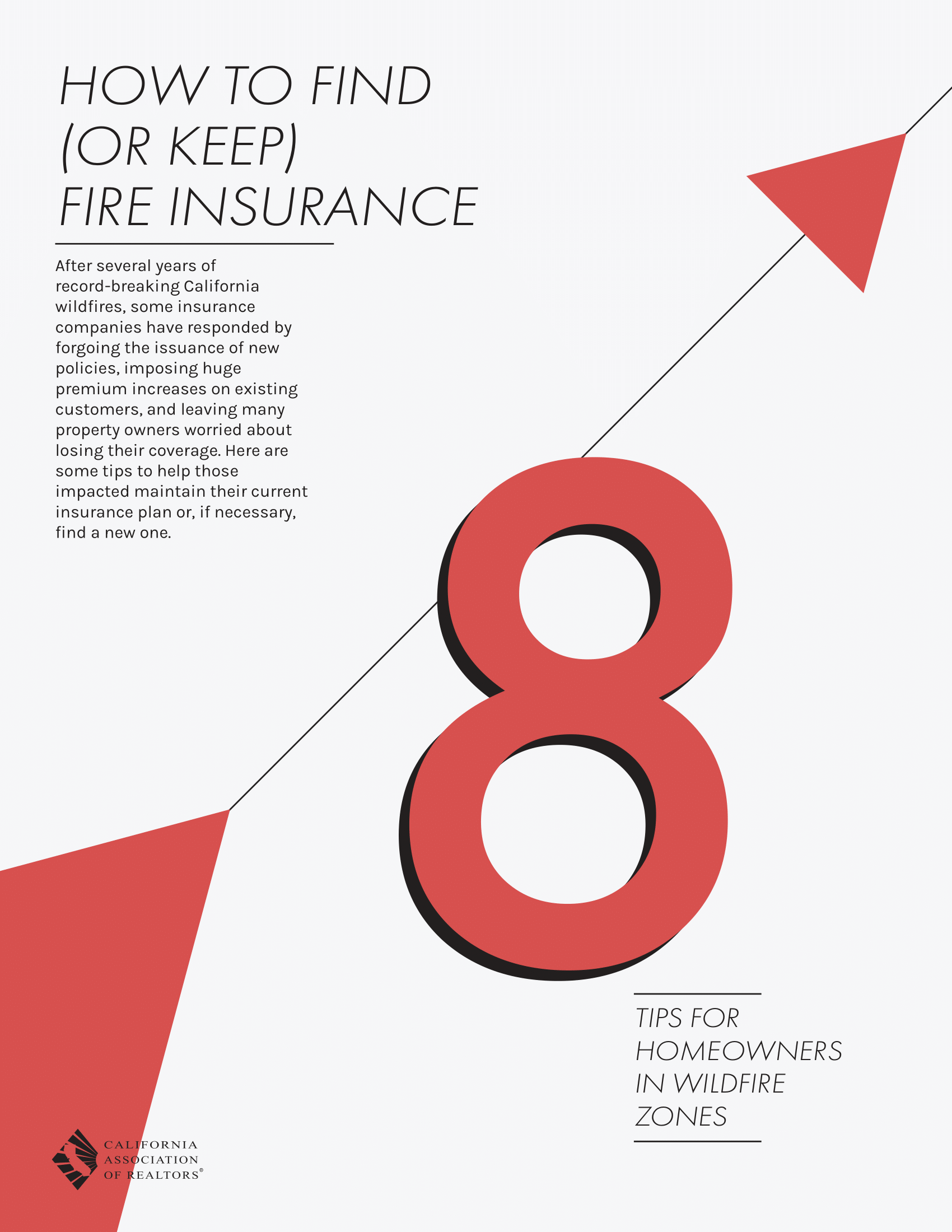 Due to wildfire risks in California and an increase in construction costs, insurance companies are forgoing the issuance of new policies, increasing premiums, and making finding and maintaining coverage in many areas of the state more difficult than ever. C.A.R. has gathered and prepared the items below to help consumers maintain their current insurance plan or, if necessary, find a new one.